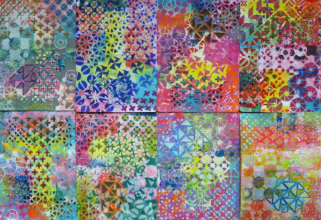an 8 x 10 Gelli plate and Crazy Quilts Bold & Beautiful, Crazy Quilts Calm and Frenzy, and Crazy Quilts Crosses and Rounds add