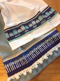 2) Iron a fold approx. 1/4” around all sides of the stenciled fabric band. Pin the band to the front of the dishtowel about 2 “ from the bottom. Sew the band to the dishtowel. (see in progress pic.)
