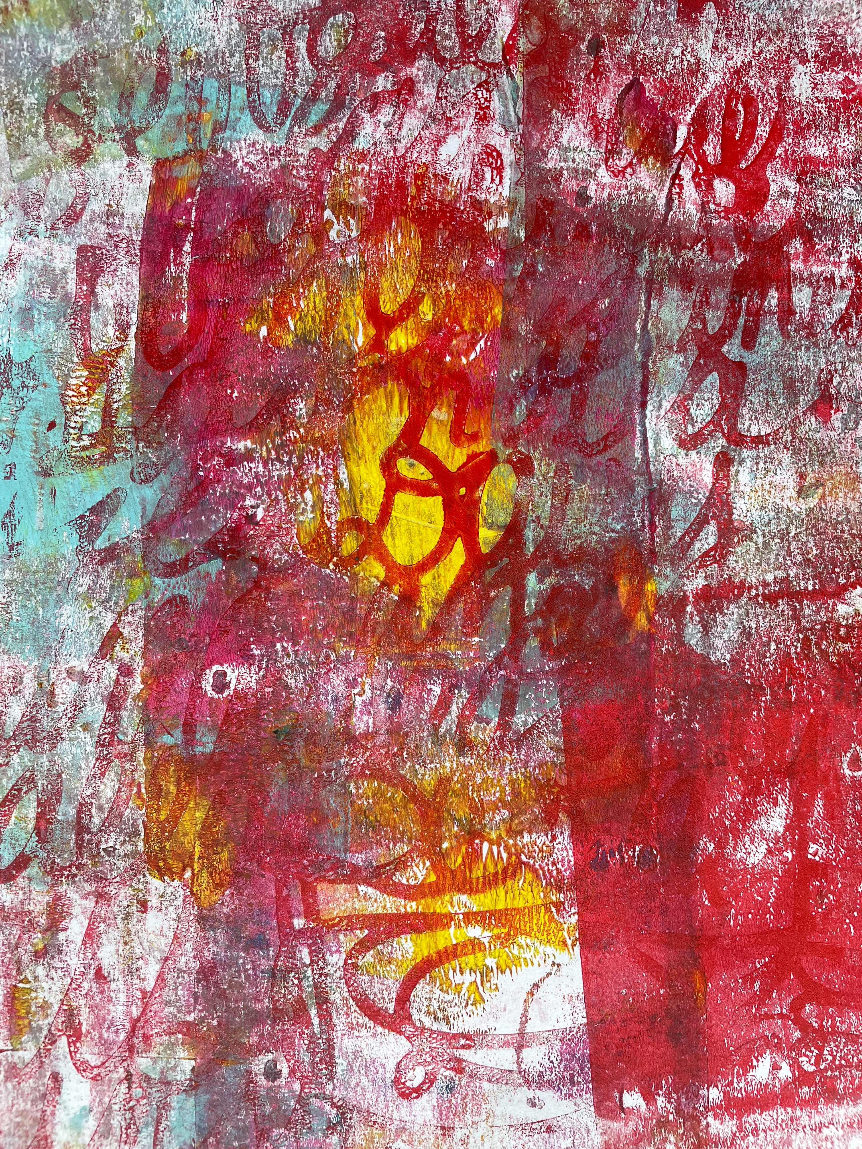1. Using 2 different colours of acrylic paint (I use a mix of different brands but like Amsterdam Standard a lot for its wide range of colours), brayer them onto your plate and take a print. Without cleaning your plate add more colours and keep taking prints.